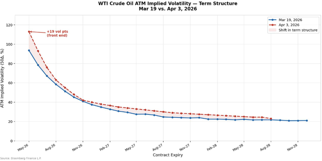 Should the disruption last longer than the volatility surface currently implies, parties may be caught underhedged. If the shock evolves into a longer-lasting issue, a larger repricing could occur in longer-dated oil prices and midcurve volatilities, not just the front end.