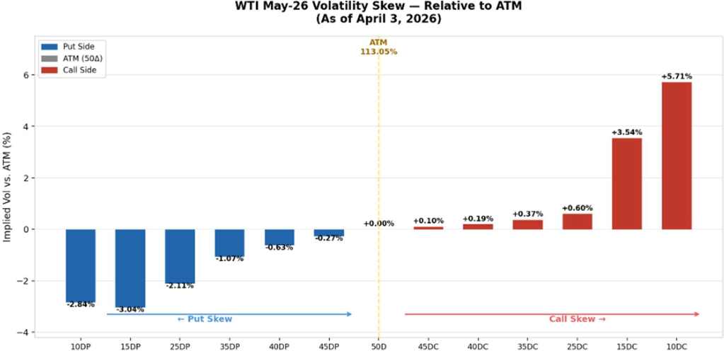 This is the opposite profile from the COVID crisis, which produced steep volatility skew as demand destruction risk dominated.