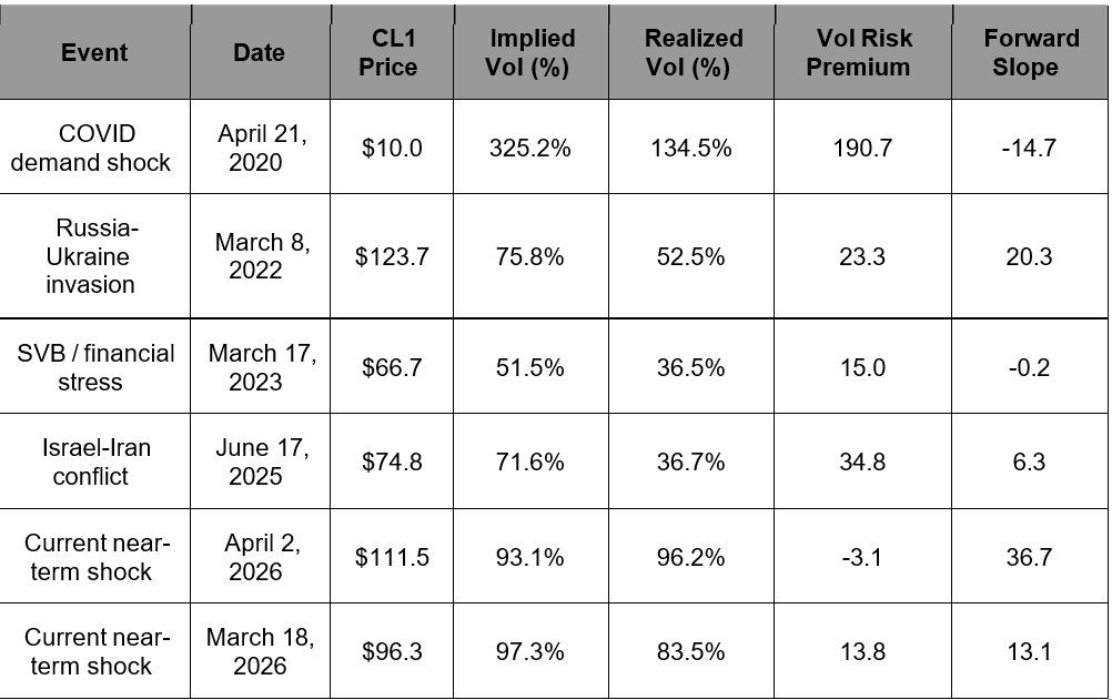 Front-end implied volatility is elevated compared to most recent shocks. The table below benchmarks the current market against four comparable historical episodes, using WTI front-month (CL1) pricing, the OVX implied volatility index, 20-day realized volatility, the volatility risk premium (implied minus realized) and the forward curve slope (CL1 minus CL6).